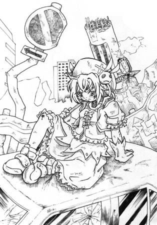 キャラの服に色が入ってないのは別に手抜きとか忘却とかアレとかじゃ無くて、単にこの幼女の服が全体的に暗色オンリーなため、タッチだけで色入れるとワケ分からない事になってしまうような気がしたからです<嘘も方便<ち、違。マジマジ。